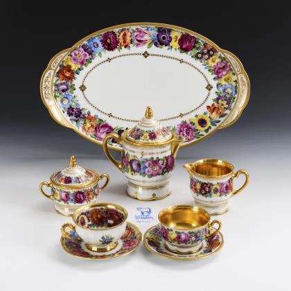 8 pieces. Teapot (h 18 cm), creamer (h 9 cm), sugar bowl (h 11 cm), 2 different cups (h 5,5 and 6 cm) with 2 different saucers (Ø 14,5 cm) and oval tray (l 46,5 cm).