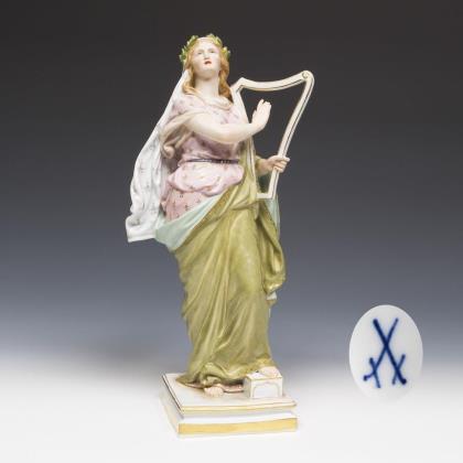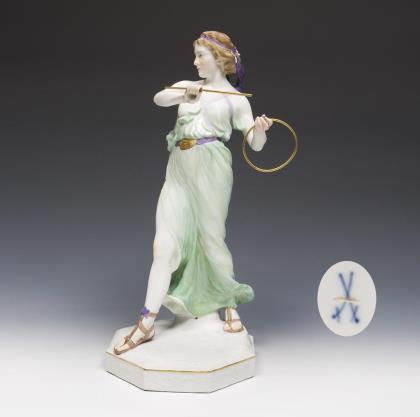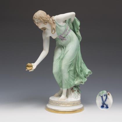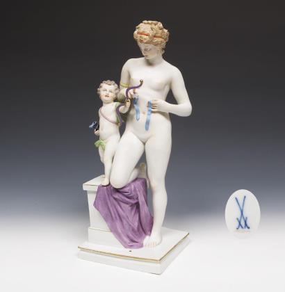 Modell von Rudolf Hölbe 1885. Pendant zu Modell-Nr. N 196 "Psyche". Farbig bemalt, gold staffiert, montierte Plinthe. Pressmarke, Schwertermarke, undeutliches Künstlersignet