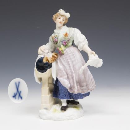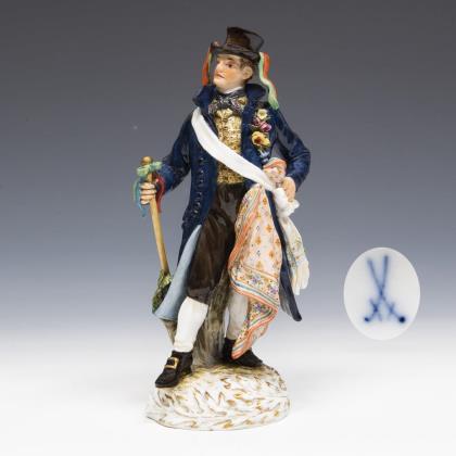 Modell von Hugo Spieler 1897-1898. Aus einer Serie von 25 Trachtenfiguren. Farbig bemalt, gold staffiert. Ritzmarke, Pressmarke, Malermarke, Schwertermarke, Jubiläumsmarke