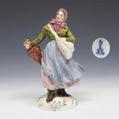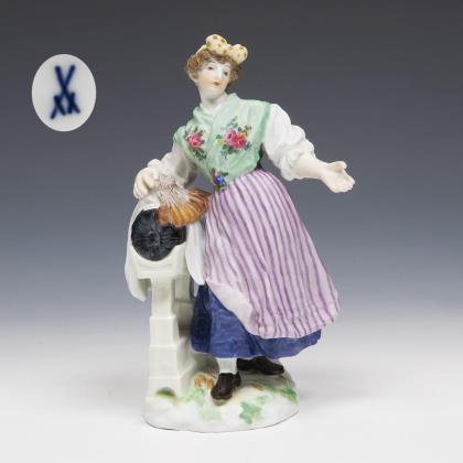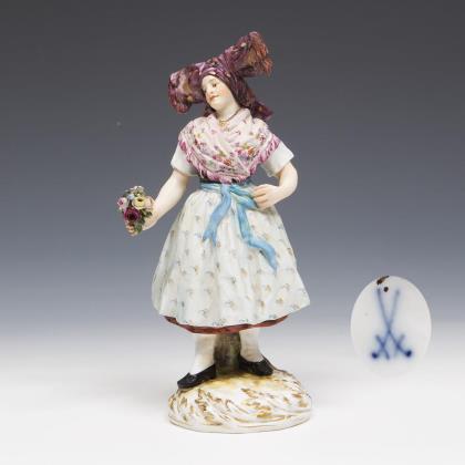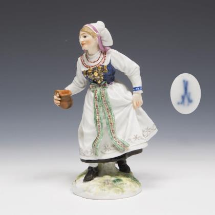 Modell von Hugo Spieler 1897-1898. Aus einer Serie von 25 Trachtenfiguren. Farbig bemalt, gold staffiert. Ritzmarke, Pressmarke, Malermarke, Schwertermarke mit Punkt
