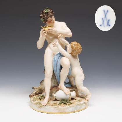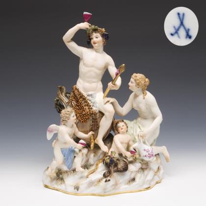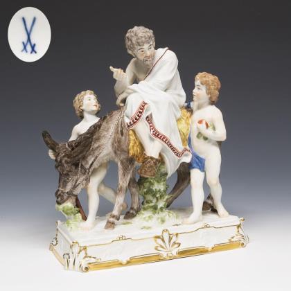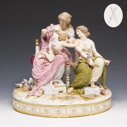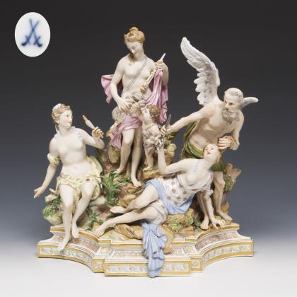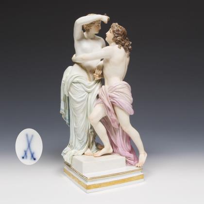 Modell von Johann Joachim Kaendler 1774. Aus der "Großen russischen Bestellung" für Zarin Katharina II. Aus einer Serie von 40 Gruppen. Farbig bemalt, gold staffiert. Mittig montierter 2-teiliger Sockel. Ritzmarken, Pressmarken, Malermarken, Schwertermarken