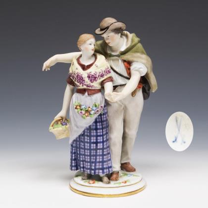 Modell von Johann Carl Schönheit 1787. Pendant zu Modell-Nr. I 60 "Die Annäherung". Farbig bemalt, gold staffiert. Ritzmarke, Pressmarke, Malermarke, Schwertermarke einmal gestrichen
