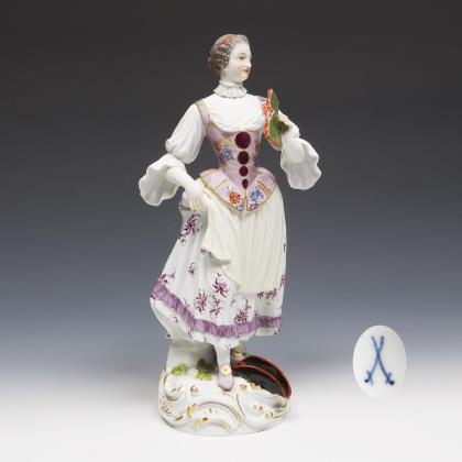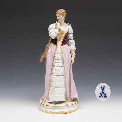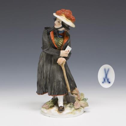 Modell von Johannes Daniel Schreitmüller 1885. Pendant zu Modell-Nr. N 165 "Sänger mit Laute". Farbig bemalt, gold staffiert. Ritzmarke, Pressmarke, Malermarke, Schwertermarke
