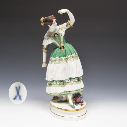 Modell von Jean Auguste Barre 1837. Elssler, österreichische Tänzerin, 1810-1884, als Florinda in Casimir Gides Ballett "Le Diable Boiteux". Farbig bemalt, gold staffiert. Ritzmarke, Pressmarke, Malermarke, Schwertermarke