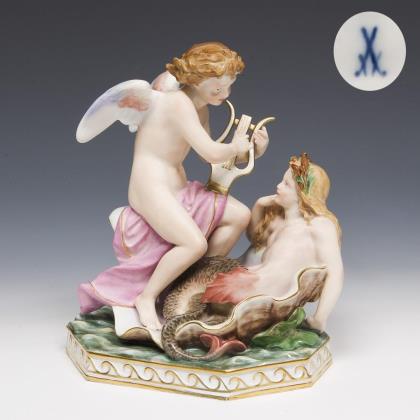 Modell von Rudolf Hölbe 1885. Pendant zu Modell-Nr. N 195 "Amor, Nachtigallen fütternd". Farbig bemalt, gold staffiert, montierte Plinthe. Pressmarke, Schwertermarken, Künstlersignet
