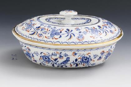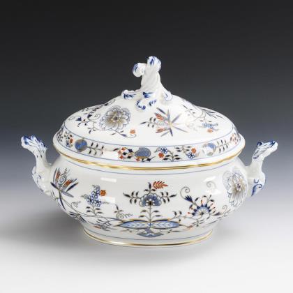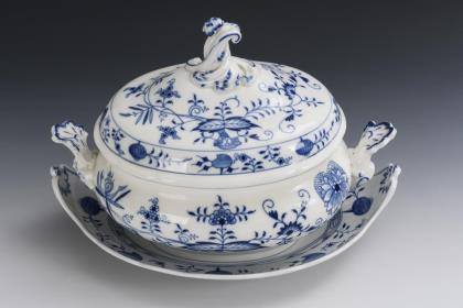 Onion pattern tureen with presentoir. Meissen.