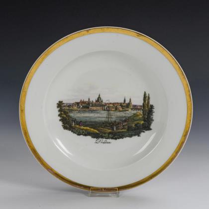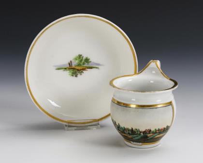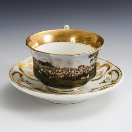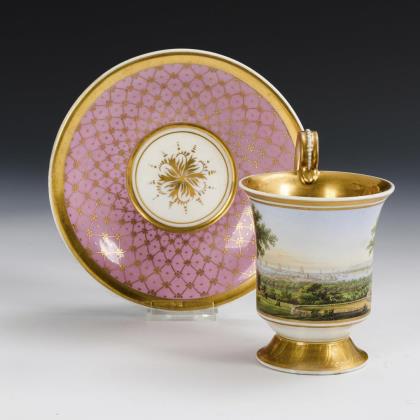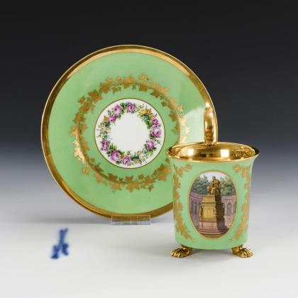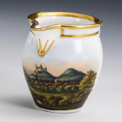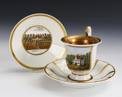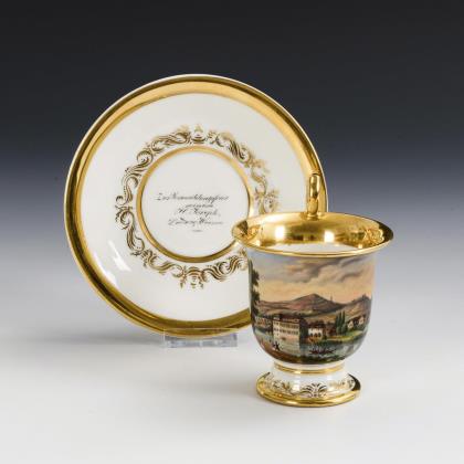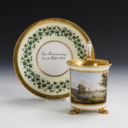 Footed bell cup with griffin's head handle. On the front a gold-framed rectangular cartouche depicting a view of the city of Jena with a view of a factory of Ludwig Weimar, in the mirror of the saucer the dedication "Zur Vermählungsfeier seinem H. Joseph. Ludwig Weimar"
