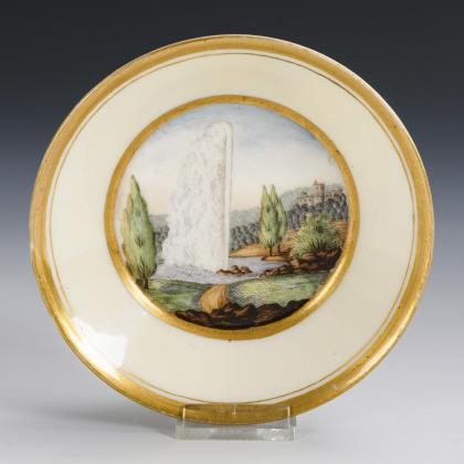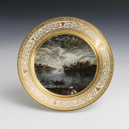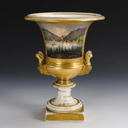 Crater vase with two gold-bronzed mascaron handles, round base, on square plinth. Gold background. On the front a rectangular cartouche with the depiction of a view of the Rhine