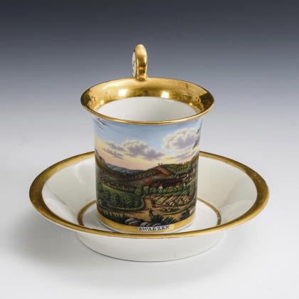 Cylindrical cup with cratered rim and palmette handle. on the outside a gold framed rectangular cartouche with inscribed view Zwätzen near Jena.