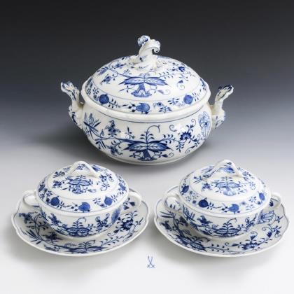 Onion pattern tureen and 2 -soup cups with saucers. Meissen.