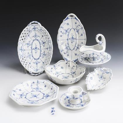 Shape "New cutout". Tureen (L 34 cm), sauce boat with lid (L 25 cm), lidded bowl (Ø 18.5 cm), sauce boat (L 22 cm), spice cruet with mustard spoon (Ø 11 cm) and 2 breakthrough plates (Ø 23 and 24.5 cm).