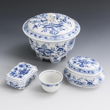 3 onion pattern tins and 1 cooper. Meissen.