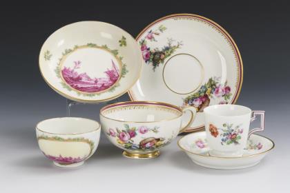 Tea cup and saucer with painting of an overturned flower basket / cup and saucer with purple landscape painting in a gold framed cartouche / 1x conical demitasse cup with angled handle and flower painting