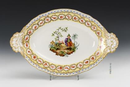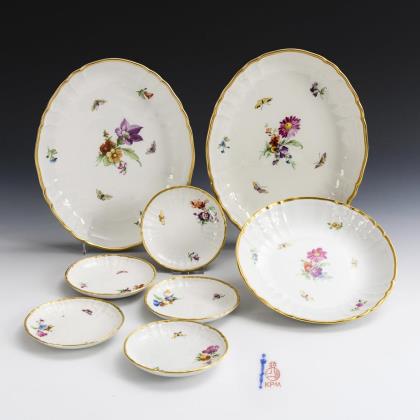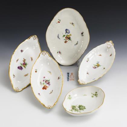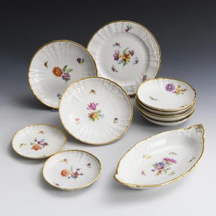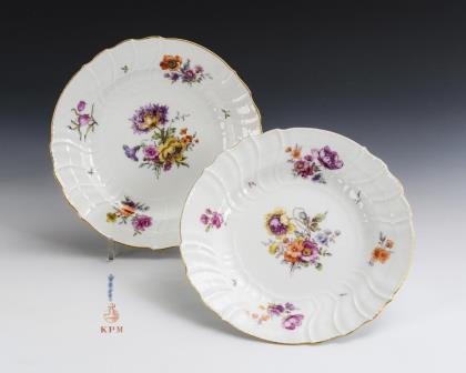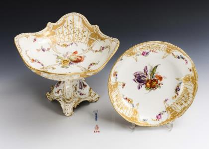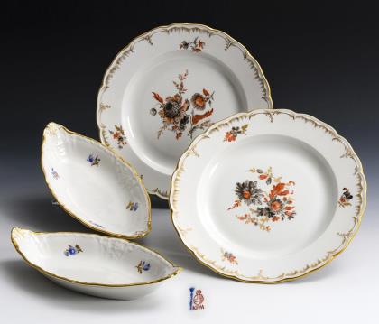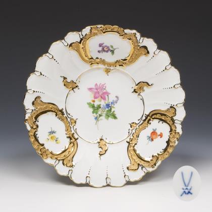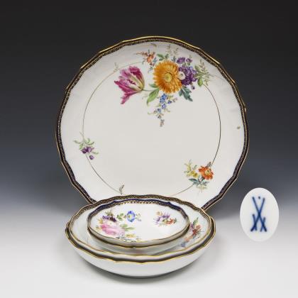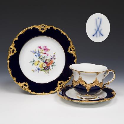 Form-Modell von Ernst August Leuteritz 1851-1853. "B-Form" und "Z-Form", kobaltblaue Ränder, reliefiert, gold staffiert, mattiert und poliert. Teller mit farbiger Blumenbemalung. Pressmarken, Malermarken, Schwertermarken