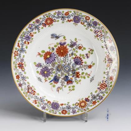 Form "Neuer Ausschnitt", Dekor-Nr. 111120. Farbige Blumenbemalung mit schräggestelltem Bukett und Einzelblüten, kobaltblauer Rand mit goldener "A-Kante", Goldstaffage. Schwertermarken, eine Schwertermarke mit Punkt