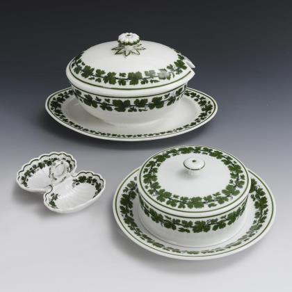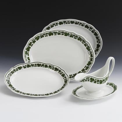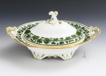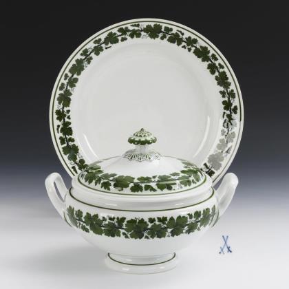 3 plates and 1 sauce boat with vine leaves decor. Meissen.