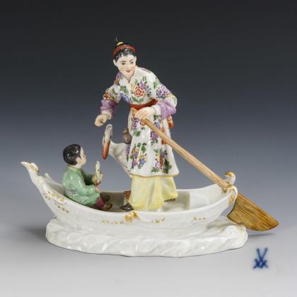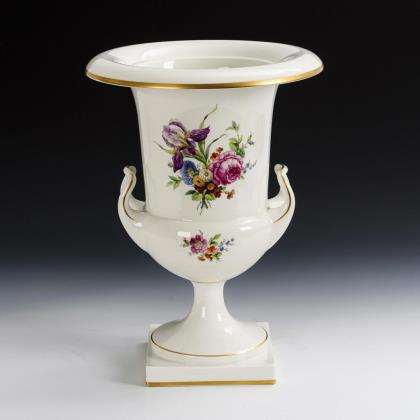 Modell von Ernst August Leuteritz 1863-1865. Reliefiert, gold staffiert, mattiert und poliert, farbige Blumenbemalung. Pressmarke, Malermarke, Schwertermarke zweimal gestrichen