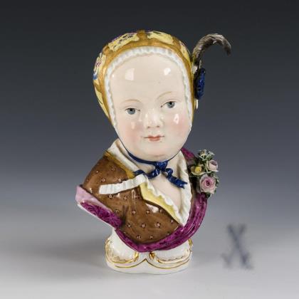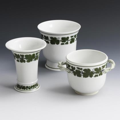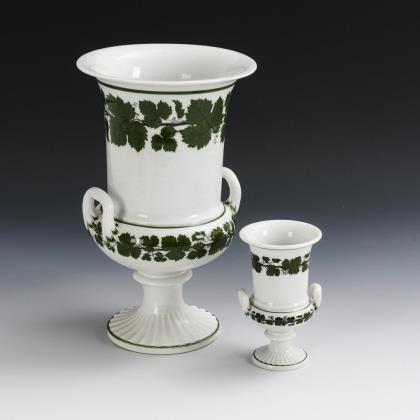 Modell von Ernst August Leuteritz und Mitarbeiter 1860-1863. Weißporzellan, frontal gedrucktes Wappen in Grün. Geschweifter Bandhenkel an reliefierter Blattrosette. Pressmarken, Schwertermarke mit Punkt viermal gestrichen