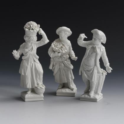 Gardener girl with flower basket in her arms, gardener girl with rose basket on her head and gardener boy with wine bucket