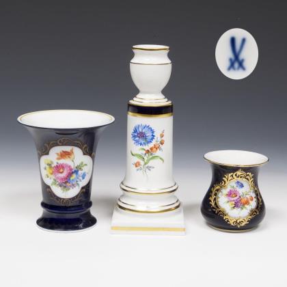 Drei Teile: Leuchter, 2 kleine Kobaltfond-Vasen. Farbige Blumenbemalung, Goldstaffage, Vasen frontal mit geschweiften Goldreserven, Leuchter mit kobaltblauem Randdekor. Schwertermarken