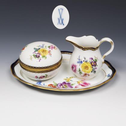 Dekor-Nr. 111120, farbige Blumenbemalung mit schräggestelltem Bukett und Einzelblüten, kobaltblauer Rand mit goldener "A-Kante", Goldstaffage. Pressmarken, Schwertermarken, Salznapf 1880-1923