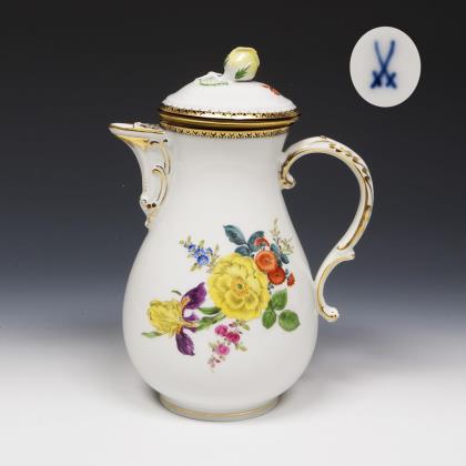 Form "Neuer Ausschnitt", Dekor-Nr. 111120. Farbige Blumenbemalung mit schräggestelltem Bukett und Einzelblüten, kobaltblauer Rand mit goldener "A-Kante", Goldstaffage. Fassungsvermögen 1,2 Liter. Malermarke, Pressmarke, Schwertermarke