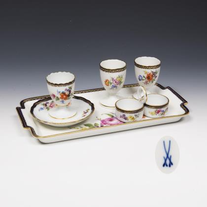 3 cups and 3 egg cups with vine leaves decor. Meissen.