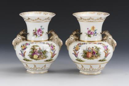 Pair of rams head vases with Watteau painting. KPM Berlin.