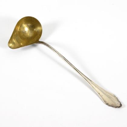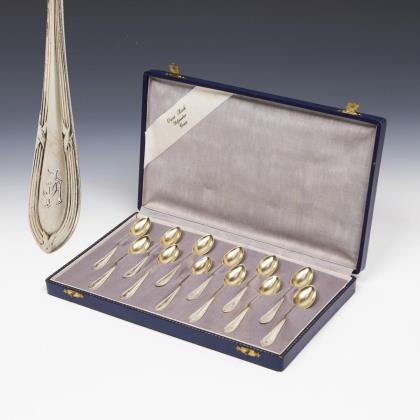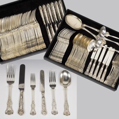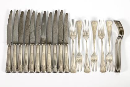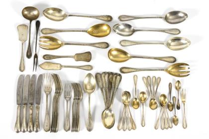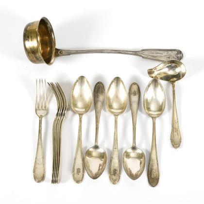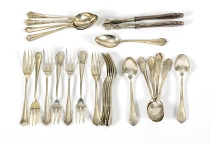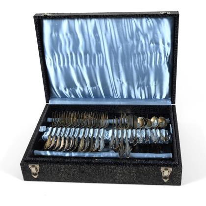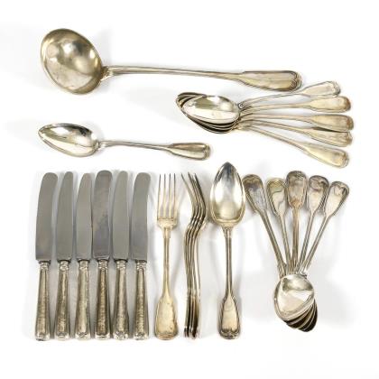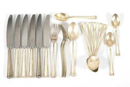 Restbesteck mit graviertem Monogramm MG: 36 Teile: 6 Messer, 6 Gabeln, 6 Esslöffel, 6 Menue-Messer, 6 Menue-Gabeln, 6 Kuchengabeln. Restbesteck ohne Monogramm: 39 Teile: 6 Messer, 6 Gabeln, 6 Esslöffel, 6 Menue-Messer, 5 Menue-Gabeln, 6 Kuchengabeln, 2 Fleischgabeln, Buttermesser, Käsemesser. Messer mit rostfreien Klingen. Punzen: Halbmond und Krone, Feingehalt, Fabrikmarke. Kaffeelöffel (Form "Chippendale") und Kelle Gebrüder Reiner, Krumbach (Bayern, 1874 gegründet)