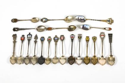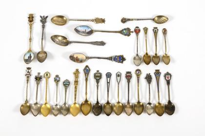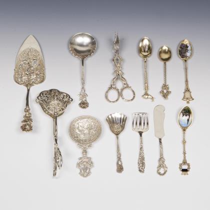 Durchbrochen gearbeitet, reliefiert. Zwei Löffel mit farbigen Email-Ansichten, eine Laffe graviert: Karlsbad 1898. 8 Teile diverses Vorlegebestck, 4 Kaffeelöffel. Punzen: Feingehalt, teils mit Halbmond und Krone, zwei Löffel Wien 1872-1921