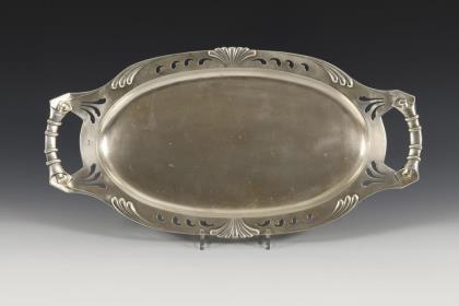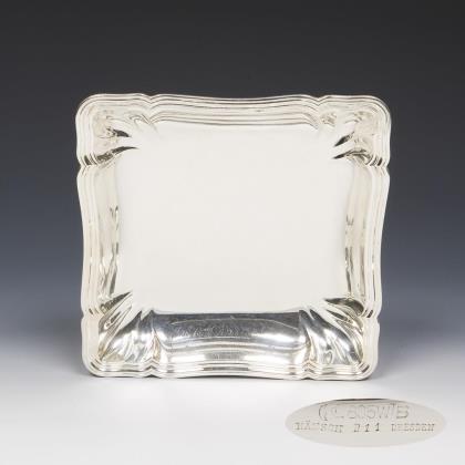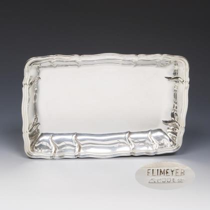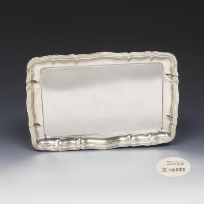Passig geschweifte rechteckige Form mit vollem Profilrand. Schwere qualitätsvolle Ausführung. Punzen: Halbmond und Krone, Feingehalt, Fabrikmarke, Modell-Nr., Maßangabe