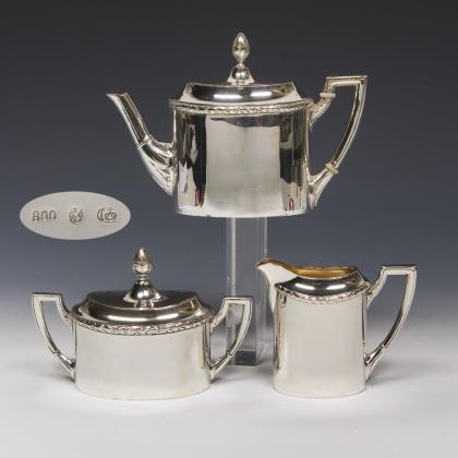 Ovale glatte Form mit reliefierten Lorbeerblatt-Bordüren. Moccakanne mit Scharnierdeckel, Dose und Kännchen innen vergoldet. Punzen: Halbmond und Krone, Feingehalt, Fabrikmarke