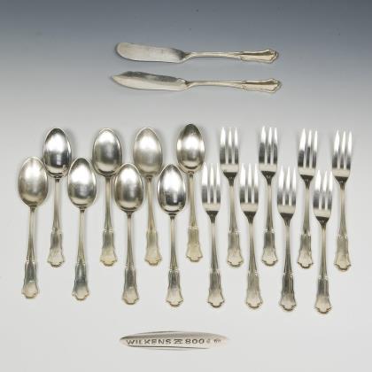 Violinen-Form mit Muscheldekor, beidseits reliefiert. 95 Teile: 12 Messer, 37 Gabeln, 12 Menue-Gabeln, 16 Menue-Esslöffel, 8 Dessertgabeln, 5 Dessertmesser, 2 Soßenkellen, 2 Heber, 1 Vorlegelöffel. 71 Teile mit dezent graviertem Monogramm. Große Messer mit rostfreien Stahlklingen. 18 Teile Wilkens & Söhne, Hemelingen, davon drei Teile 800er Silber, 24 Teile mit unbekannten Punzen