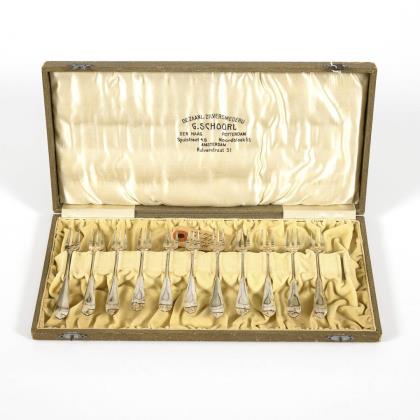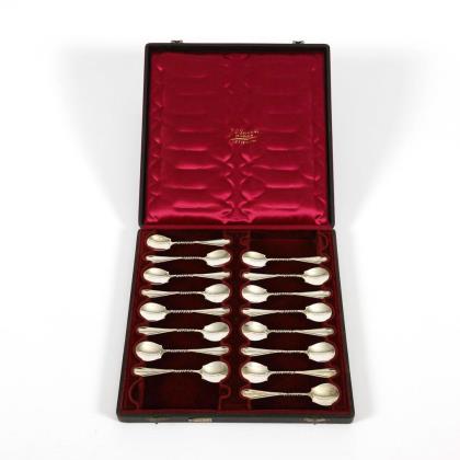 Set of 12 mocha spoons in original case. Lutz & Weiss, Pforzheim.