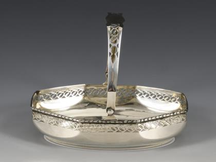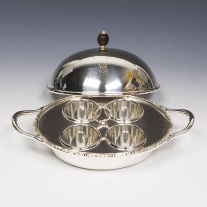 Ovale Henkelschale mit reliefiertem Randdekor. Einsatz mit montierter Ringhandhabe für vier Eier. Haubendeckel mit montiertem Ebenholz-Knauf und graviertem Monogramm. Punzen: H & H, Adlermarke