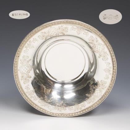 Runde gemuldete Form mit floral und ornamental gravierter Fahne, voller Reliefrand. Punzen: Feingehalt, Fabrikmarke