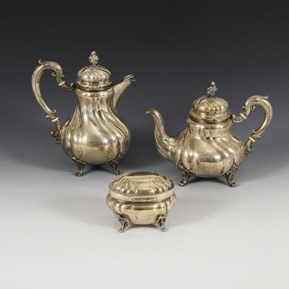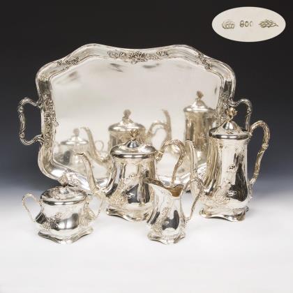 Floral reliefiert, Kannendeckel mit Scharnier. 5 Teile: Tablett, Kaffeekanne, Teekanne, Milchkännchen, Zuckerdose. Punzen: Halbmond und Krone, Feingehalt, Fabrikmarke