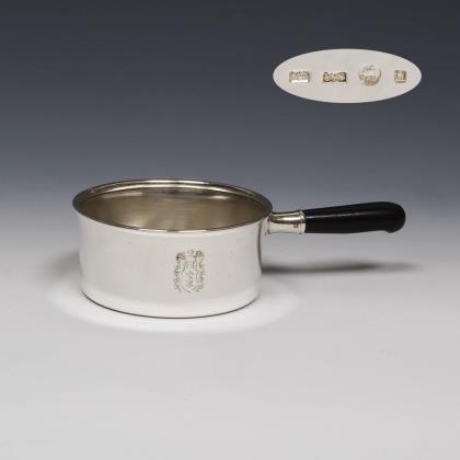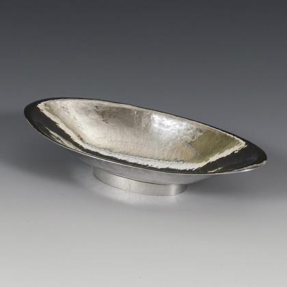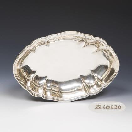 Ovale geschweifte Form mit vollem Profilrand. Auf der Innenwandung dezent graviertes Monogramm K. Punzen: Halbmond und Krone, Feingehalt, Fabrikmarke