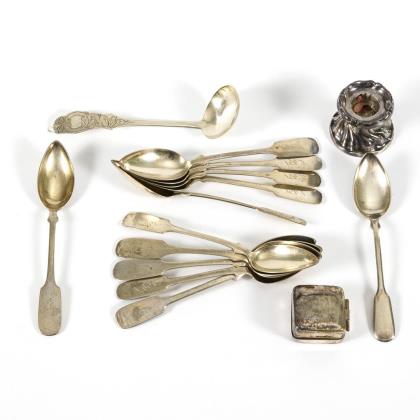 11 Biedermeier coffee spoons engraved with monogram "ES", plus 1 similar spoon without engraving, and small ladle engraved with flowers. L 14 - 15 cm. / Godroned small candlestick. H 4 cm. / Square silver metal box, 2 x 3,5 x 3,5 cm.