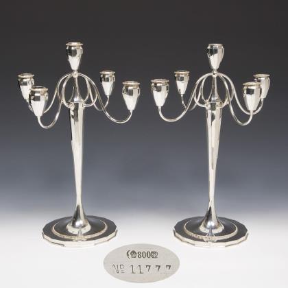 Schlanke 5-flammige Standleuchter mit vier geschwungenen Leuchterarmen und zeitlosem Facetten- und Perlleistendekor. Punzen: Halbmond und Krone, Feingehalt, Fabrikmarke