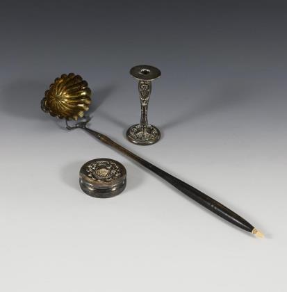 Trowel, candlestick and silver box