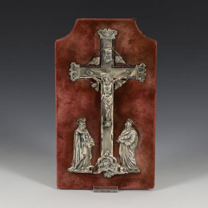Silver crucifix on plate.