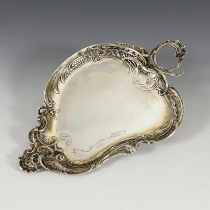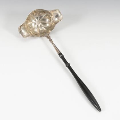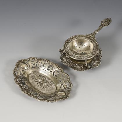 Silver tea strainer with drip tray and oval silver bowl.