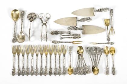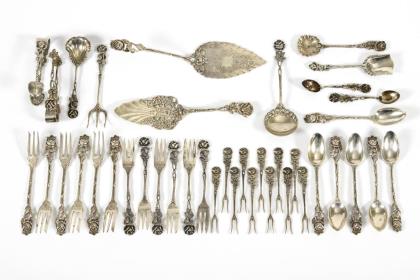 Richly decorated cutlery silver with serving pieces.