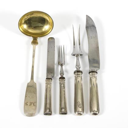 Large ladle with gilded spoon and monogram engraving "ACS". / 2-piece carving set with Augsburg thread and monogram engraving "BG". / 2-piece serving cutlery with shell reliefs.