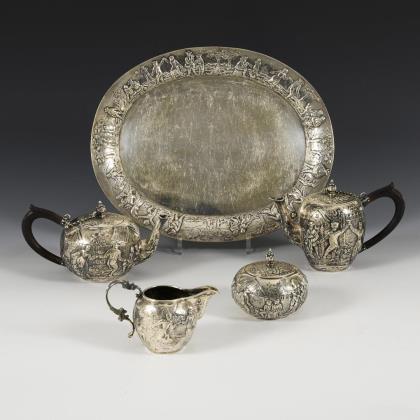 Heavy silver tea set on tray.