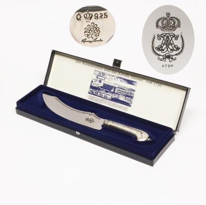 Die historische Vorlage wurde 1730 unter August dem Starken zum Aufschneiden des legendären Riesenstollens benutzt. Stahlklinge mit Ornamentbördüre, königlichem Wappen und sächsischem Wappen, im Etui. Punzen: Halbmond und Krone, Feingehalt, Fabrikmarke Hommage Dresden