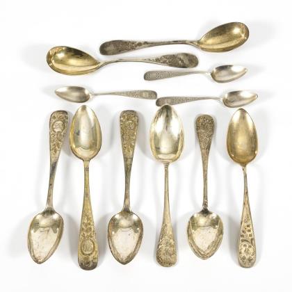 Convolute silver spoons + salad servers with floral engravings.