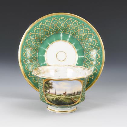 Footed, polygonal bell-shaped cup with a pointed handle. Dark green base with ornamental gold painting in relief, an oval cartouche with a view of the city on the front