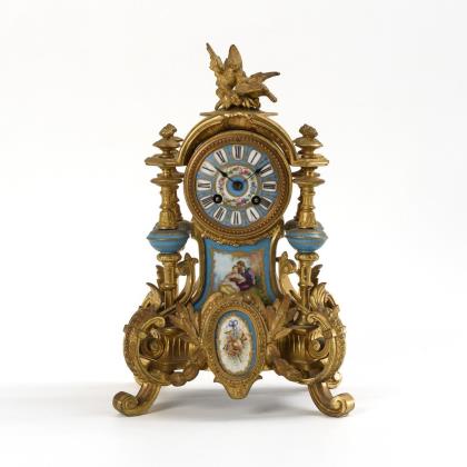 639: Bronze-Kaminuhr mit farbigen Porzellaneinlagen.